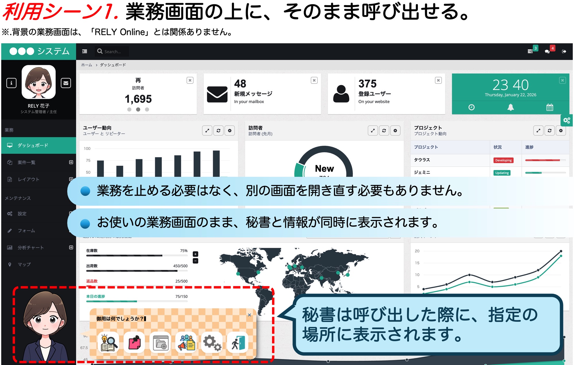 業務画面とは分離される (別画面で確認が必要) |