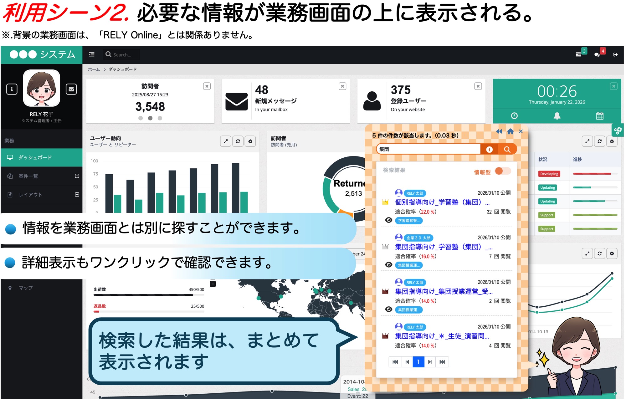 | 業務画面との関係 | 業務を中断せずに検索・参照が可能 (作業中の画面で全て完結する) |