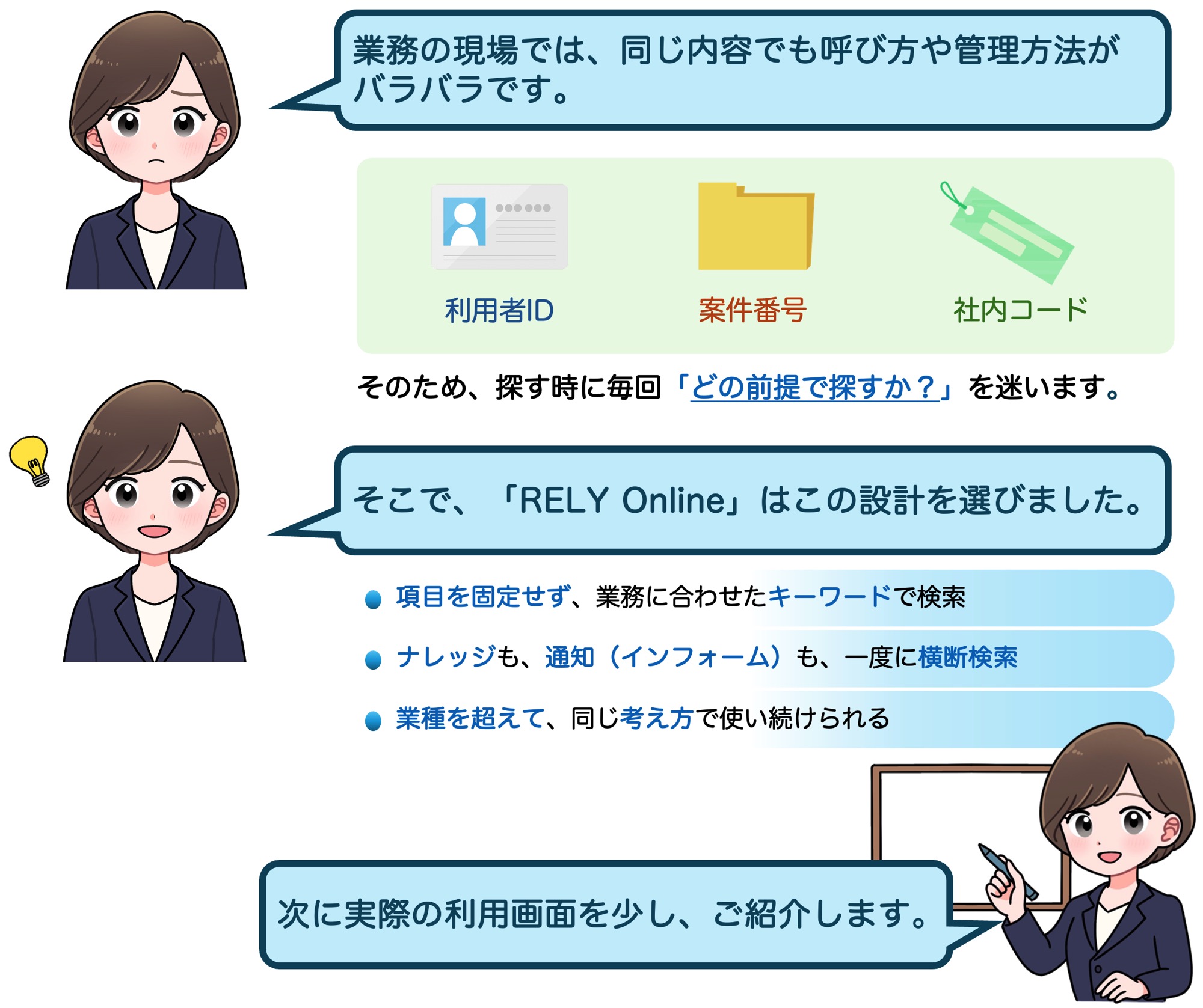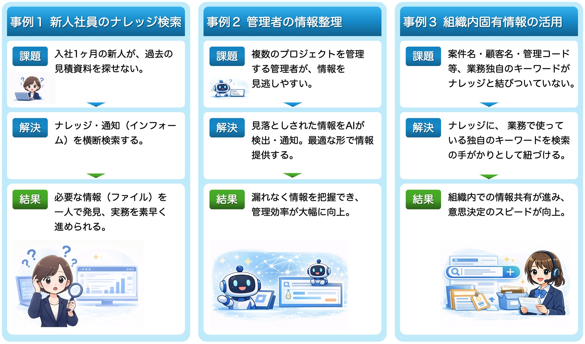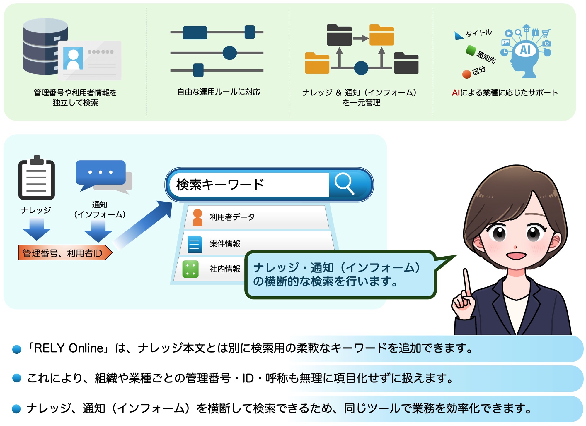 | 検索体験 | 検索結果に応じて、ナレッジ/通知(インフォーム)の検索対象を切り替えながら参照 | 全文検索・ファイル検索が中心 |
